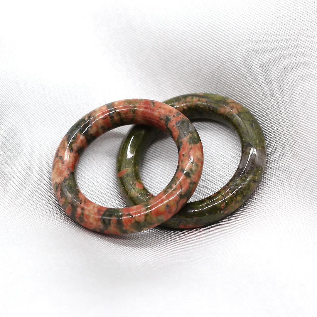 Anneau en unakite, pierre naturelle composée de nuances vertes et rosées, à l’aspect moucheté caractéristique.