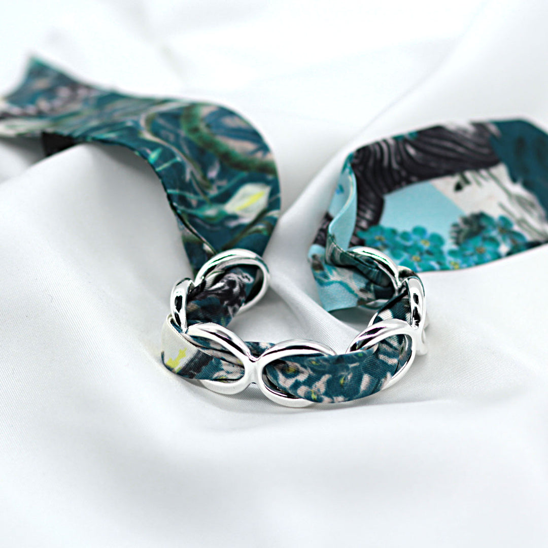 Notre bracelet emblématique marie la noblesse de l'argent à la délicatesse d’un mini twill de soie imprimée, interchangeable à l’infini.