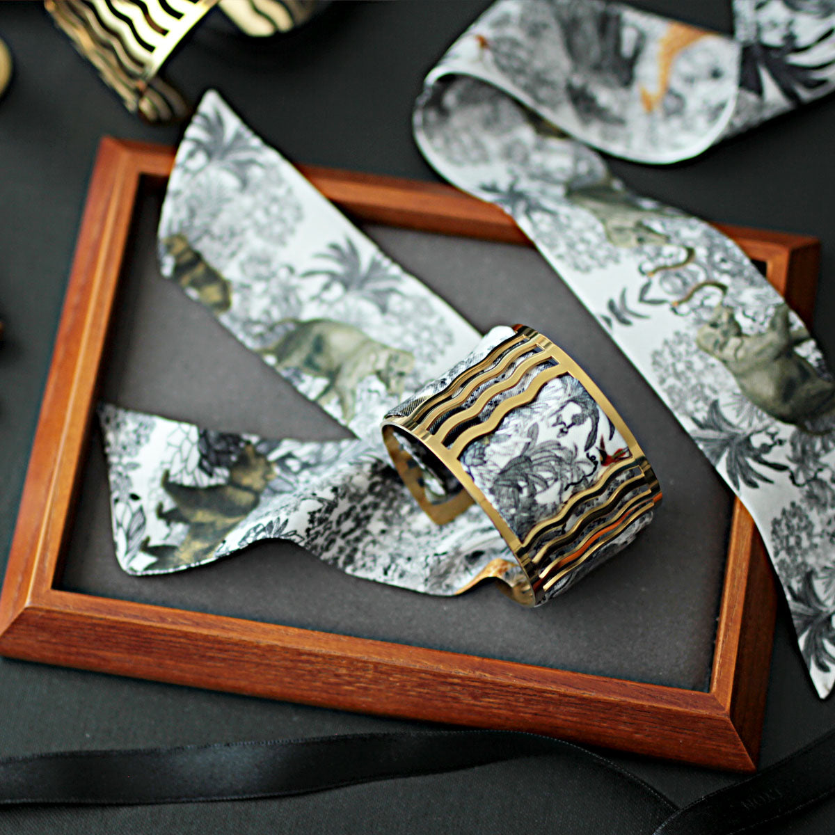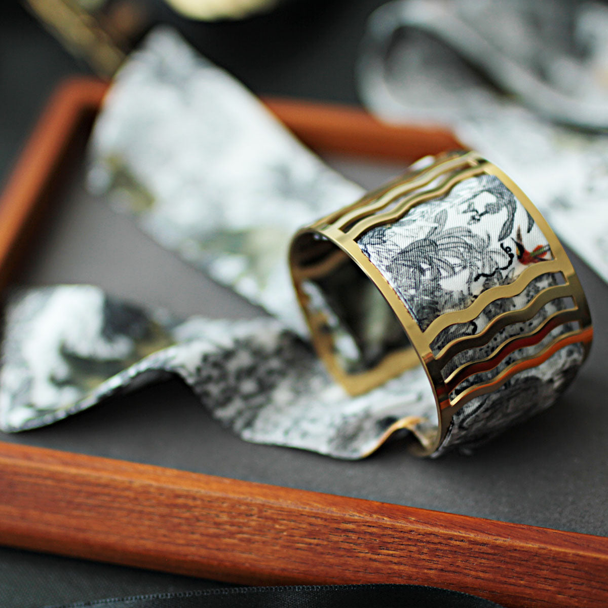 Notre manchette emblématique marie la noblesse du laiton doré à l’or fin 18 carats à la délicatesse d’un mini twill de soie imprimée, interchangeable à l’infini.