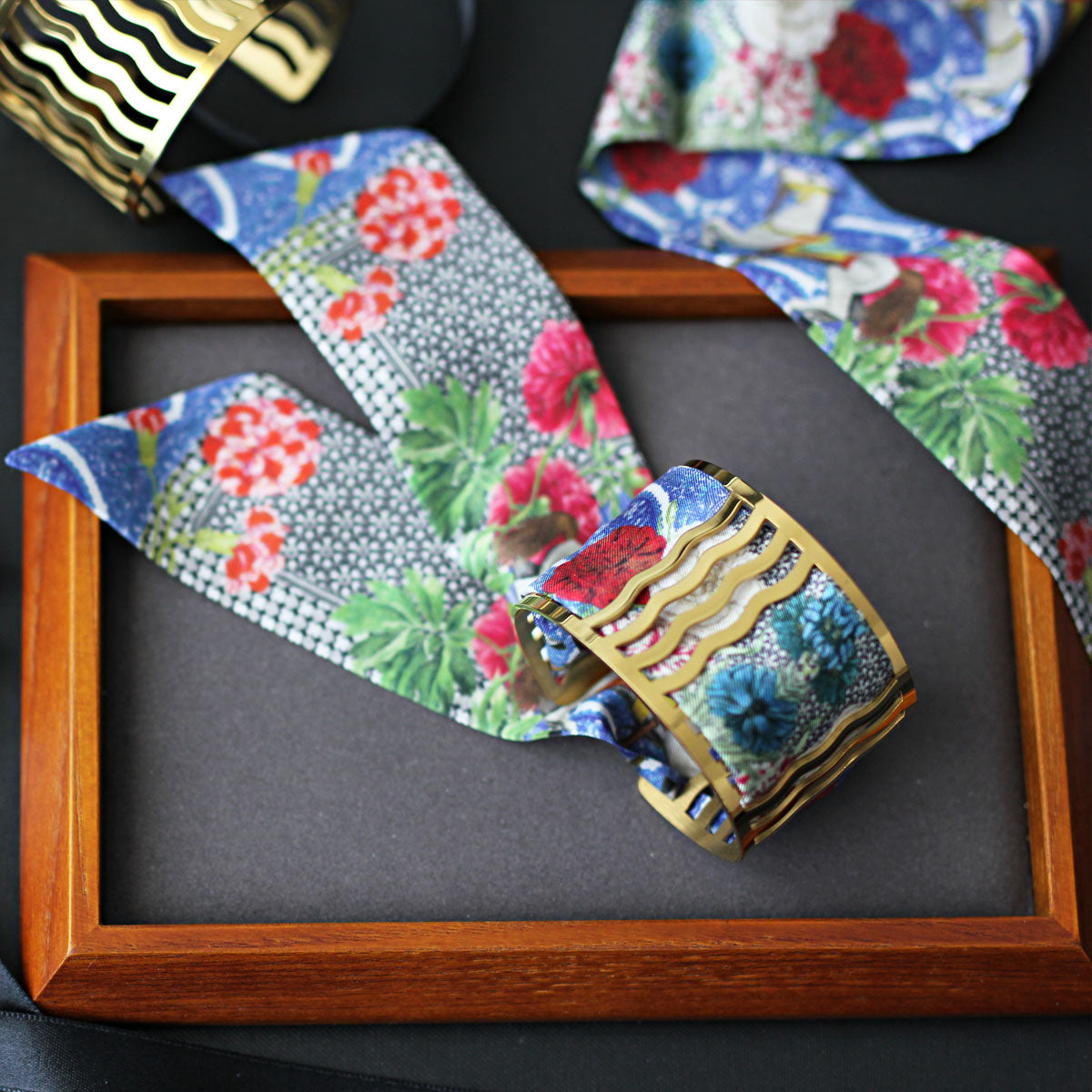 Notre manchette emblématique marie la noblesse du laiton doré à l’or fin 18 carats à la délicatesse d’un mini twill de soie imprimée, interchangeable à l’infini.