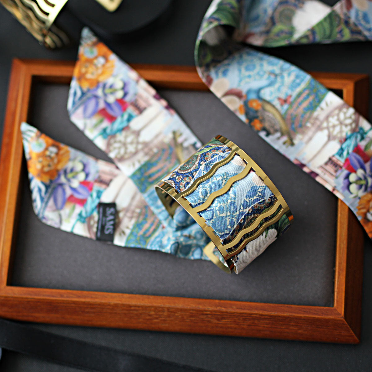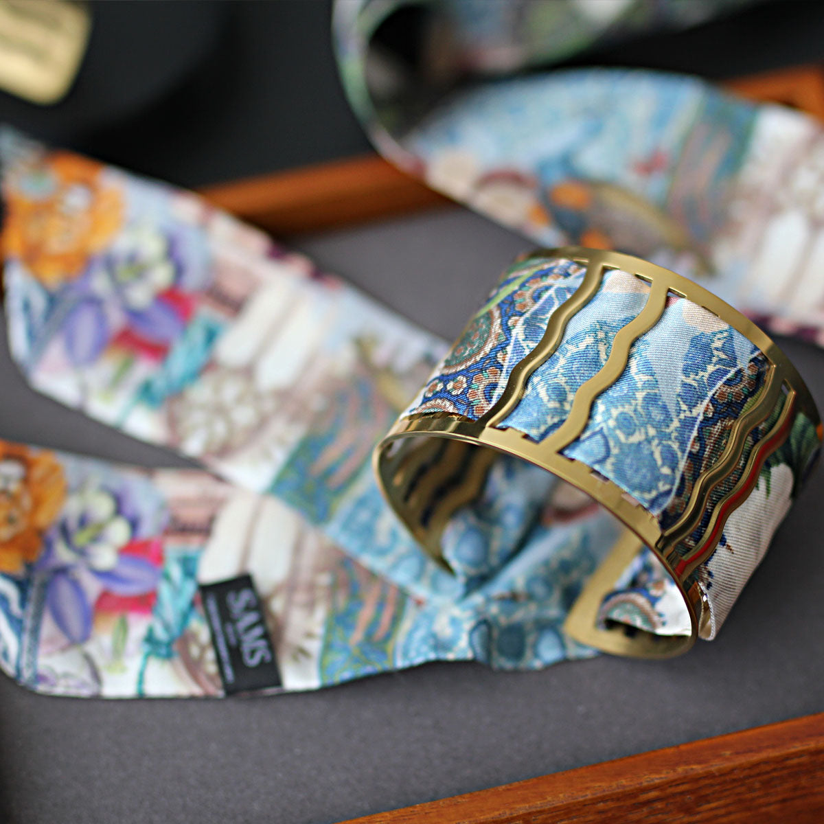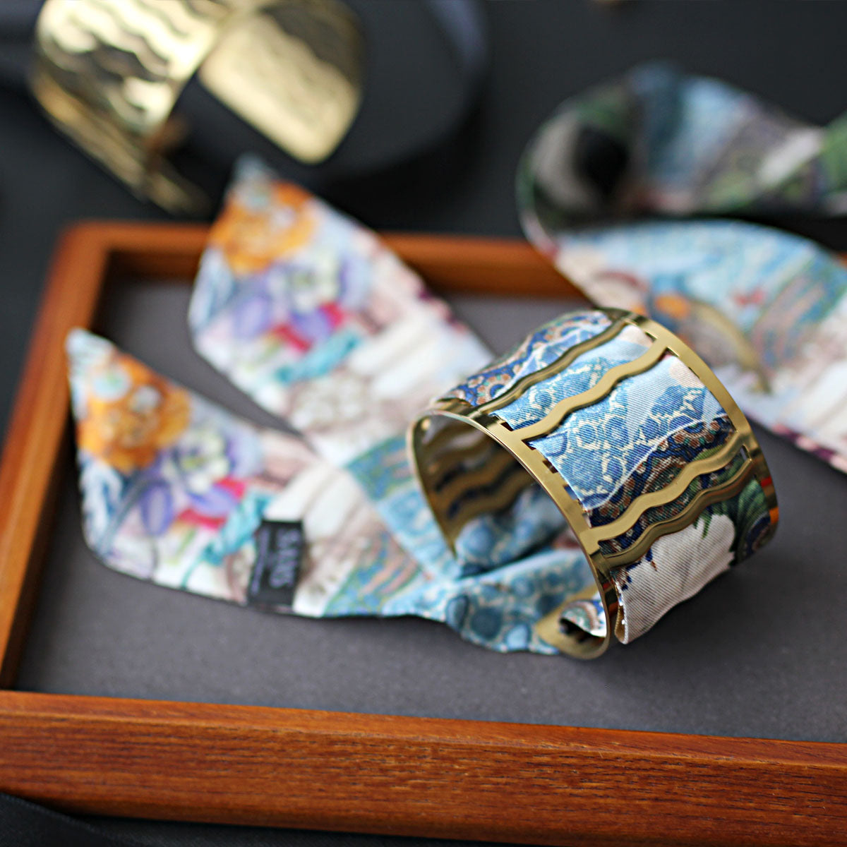 Notre manchette emblématique marie la noblesse du laiton doré à l’or fin 18 carats à la délicatesse d’un mini twill de soie imprimée, interchangeable à l’infini.