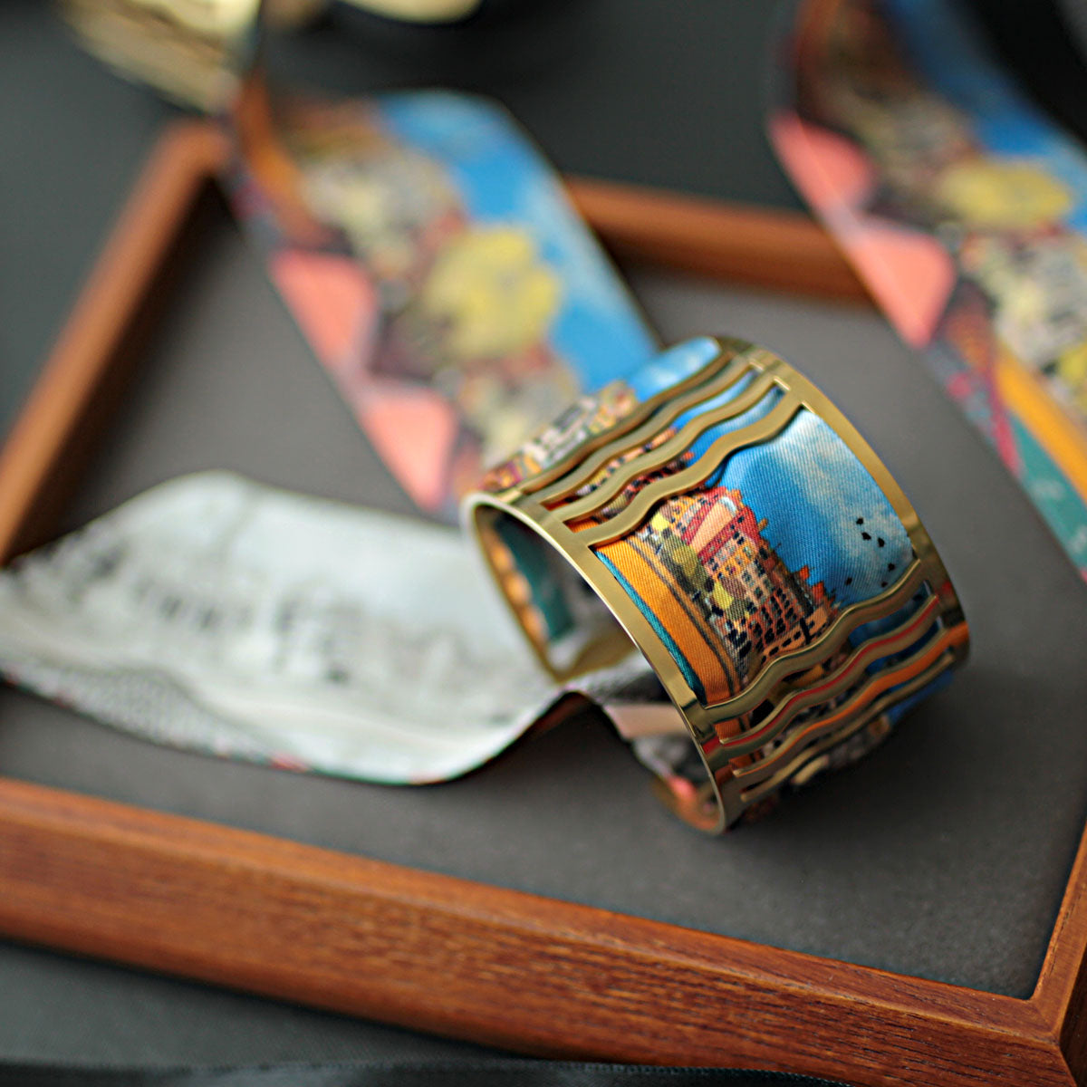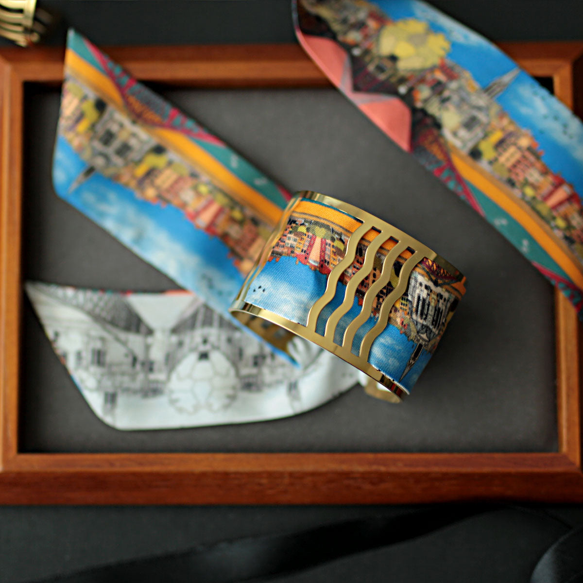 Notre manchette emblématique marie la noblesse du laiton doré à l’or fin 18 carats à la délicatesse d’un mini twill de soie imprimée, interchangeable à l’infini.