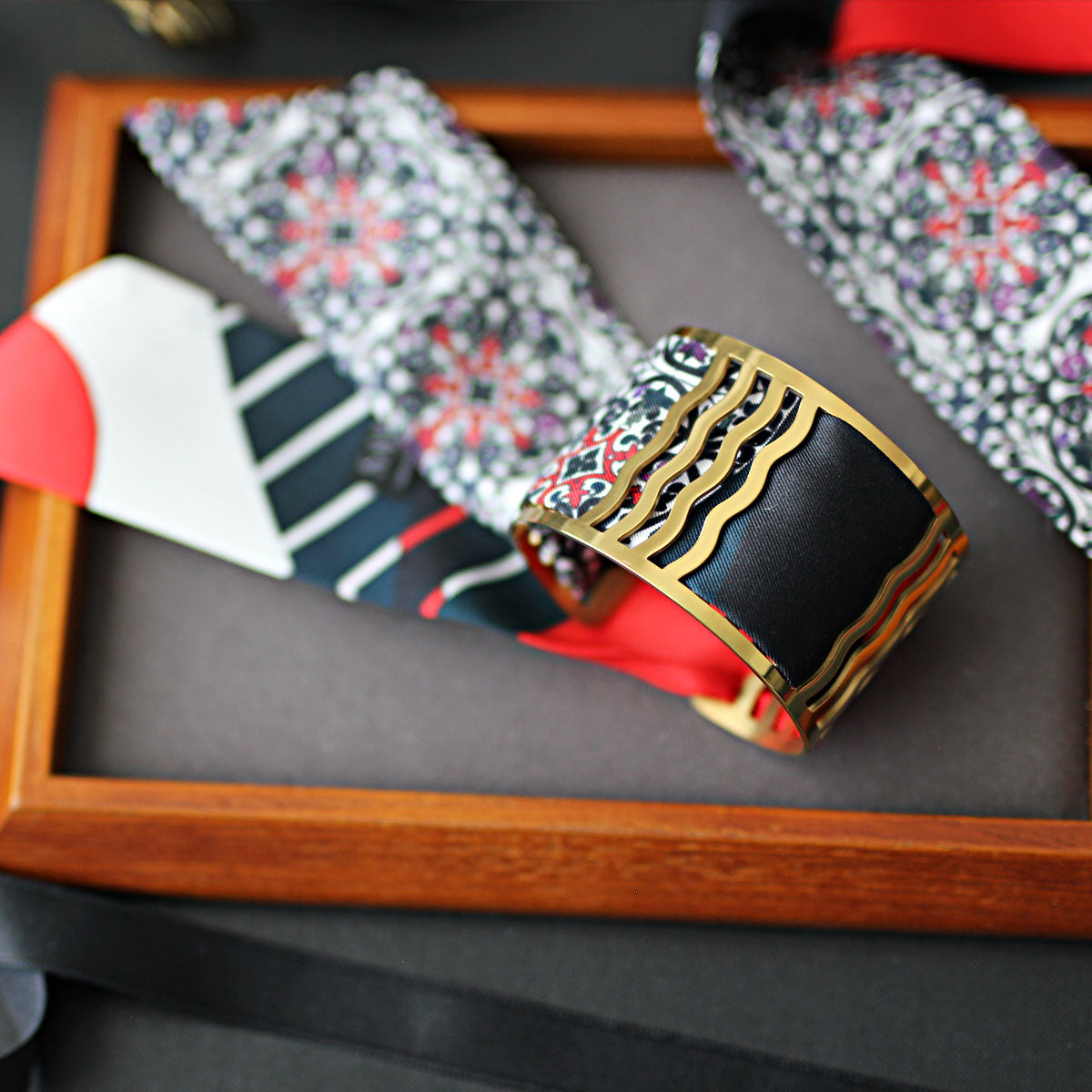 Notre manchette emblématique marie la noblesse du laiton doré à l’or fin 18 carats à la délicatesse d’un mini twill de soie imprimée, interchangeable à l’infini.