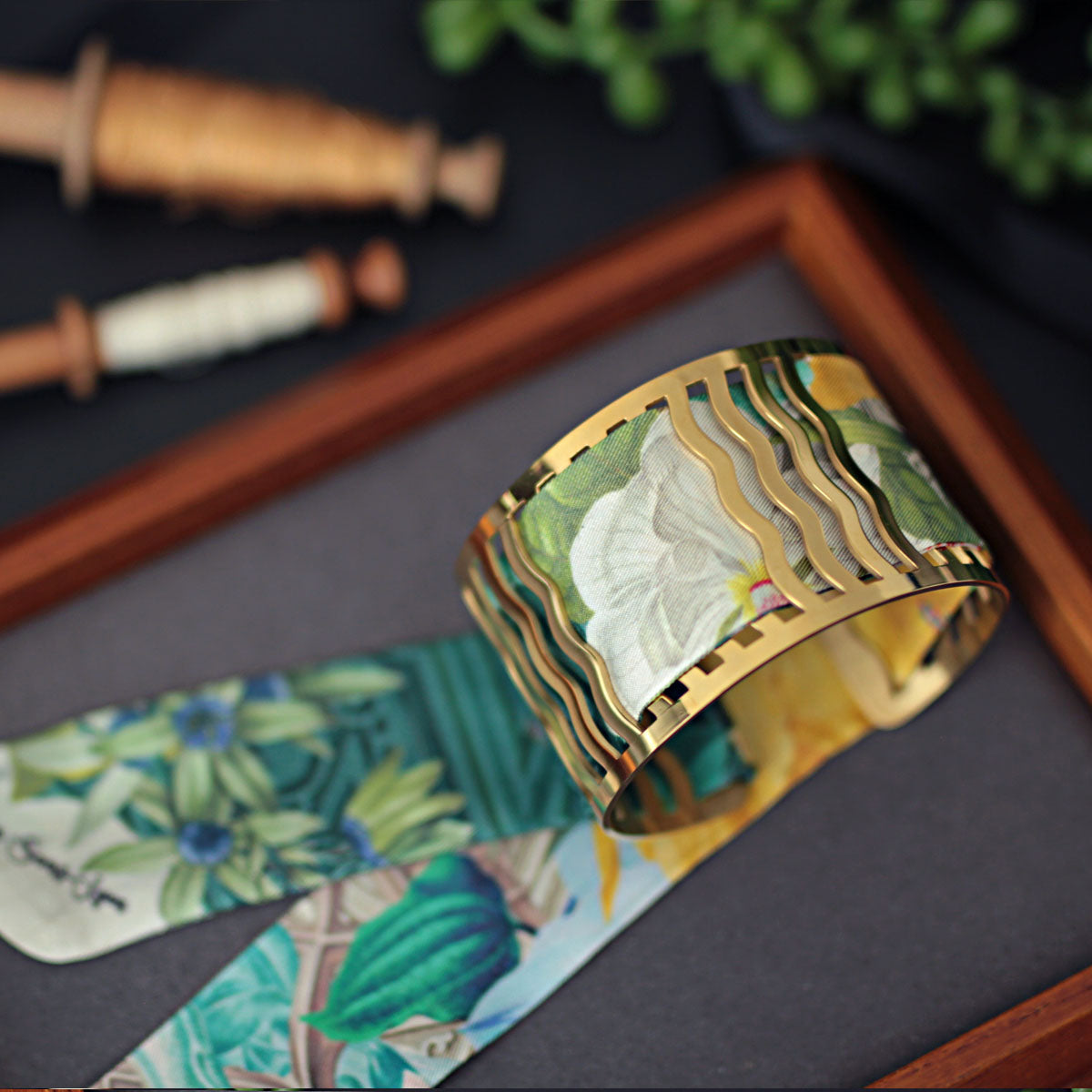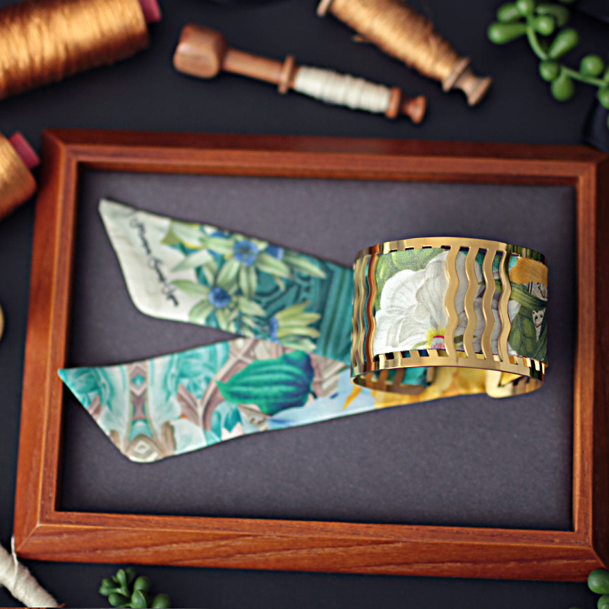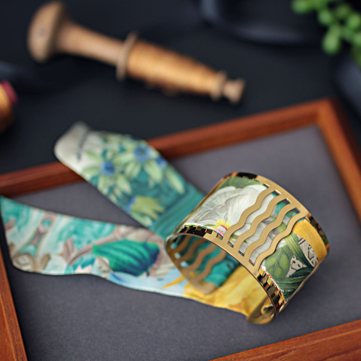 Notre manchette emblématique marie la noblesse du laiton doré à l’or fin 18 carats à la délicatesse d’un mini twill de soie imprimée, interchangeable à l’infini.