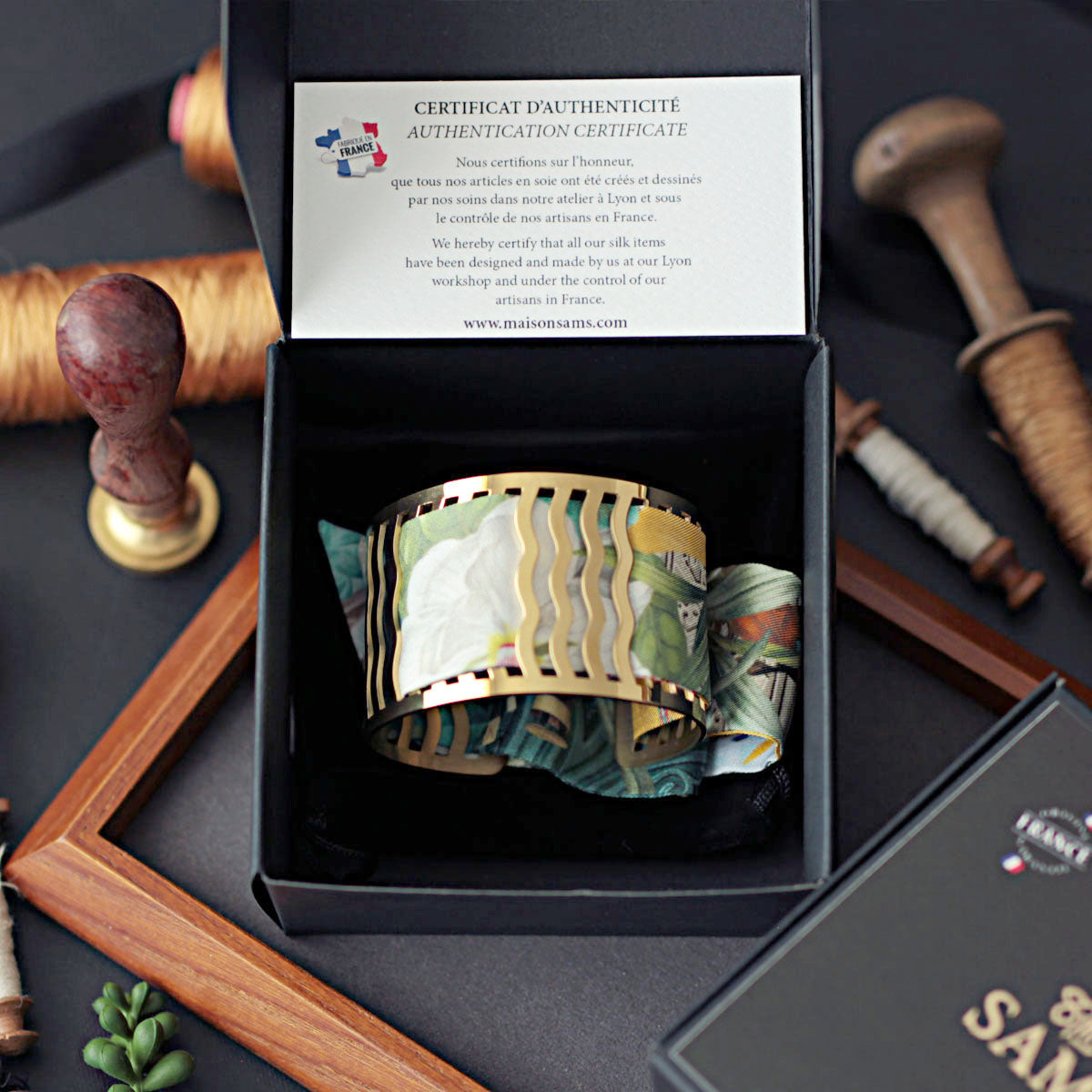Chaque bracelet est imaginé et façonné dans notre atelier lyonnais, imprimé sur un twill de soie 12 mommes.
