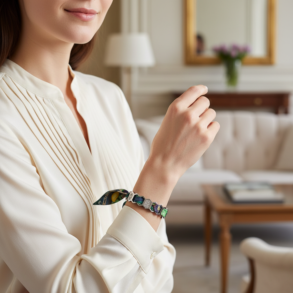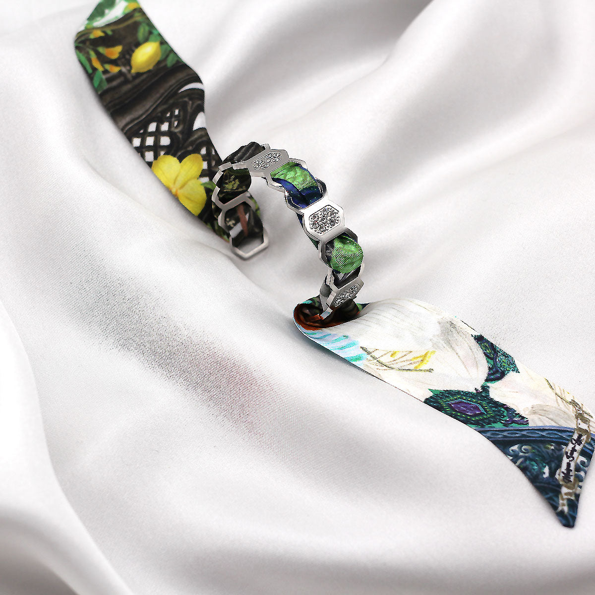 Le bracelet est amovible et modulable : il est conçu pour accueillir nos rubans et mini twills en soie, que vous pouvez glisser, changer et associer selon vos envies. Il se transforme ainsi au fil des saisons, des couleurs et des créations en soie Maison Sams.
