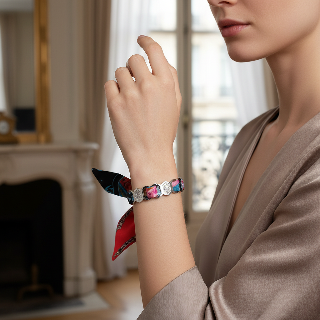 Le bracelet est amovible et modulable : il est conçu pour accueillir nos rubans et mini twills en soie, que vous pouvez glisser, changer et associer selon vos envies. Il se transforme ainsi au fil des saisons, des couleurs et des créations en soie Maison Sams.