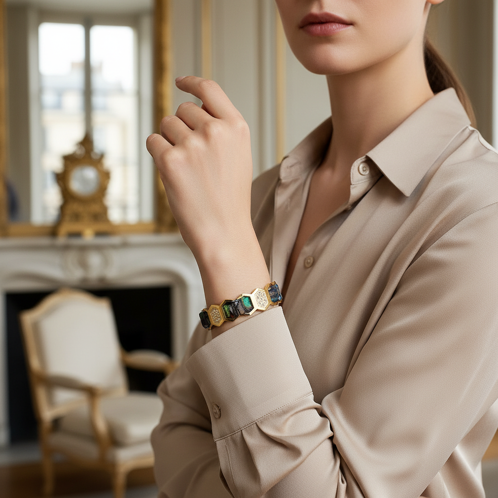 La structure du bracelet est réalisée en acier inoxydable 316L, finition dorée par procédé PVD, reconnue pour sa résistance, sa durabilité et son confort au porté.
