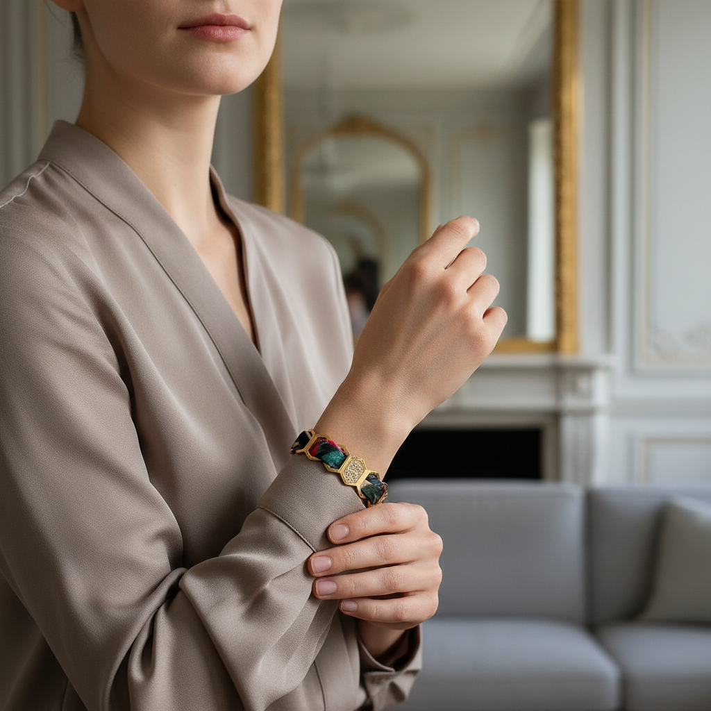 La structure du bracelet est réalisée en acier inoxydable 316L, finition dorée par procédé PVD, reconnue pour sa résistance, sa durabilité et son confort au porté.