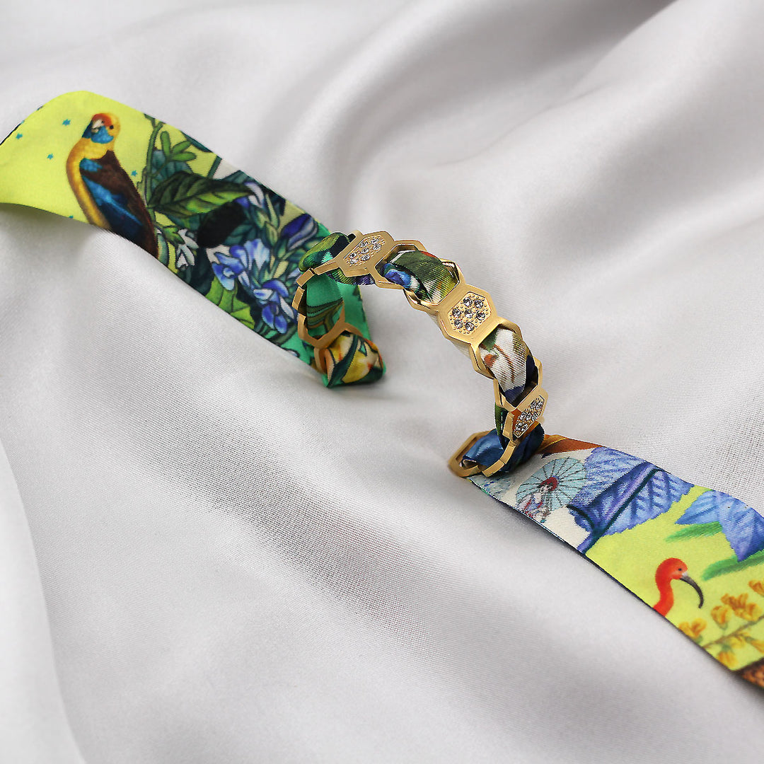 Le bracelet est amovible et modulable : il est conçu pour accueillir nos rubans et mini twills en soie, que vous pouvez glisser, changer et associer selon vos envies. Il se transforme ainsi au fil des saisons, des couleurs et des créations en soie Maison Sams.