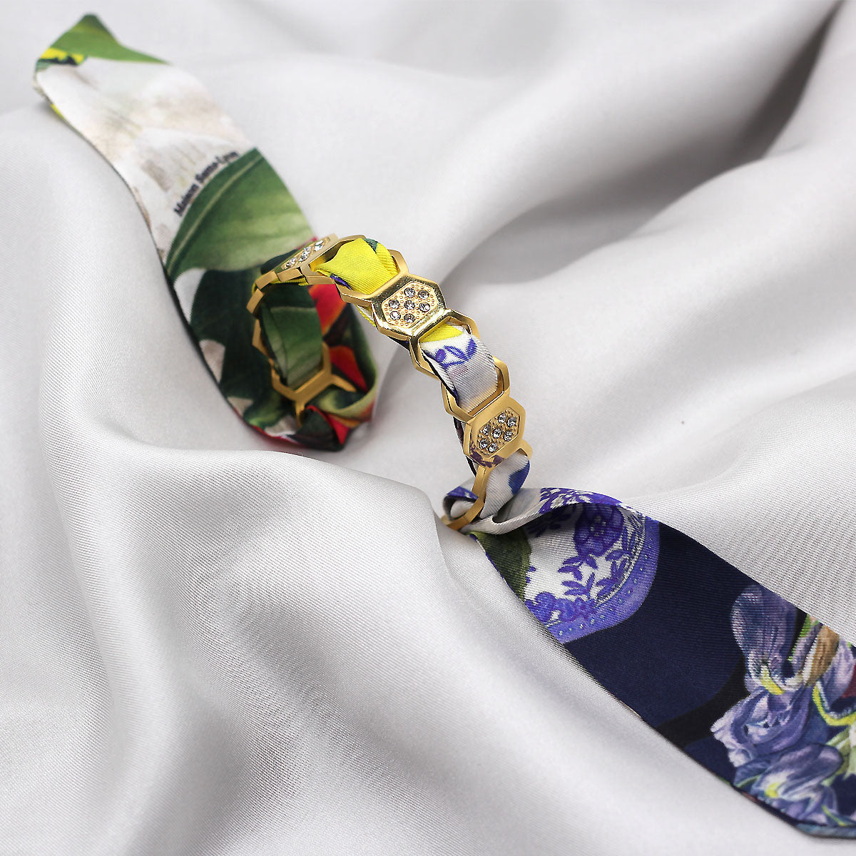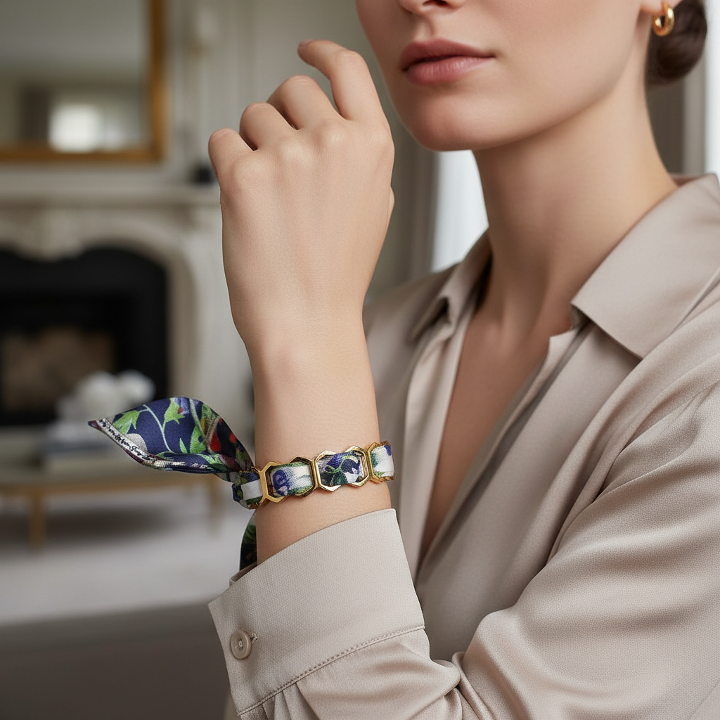 Le bracelet est amovible et modulable : il est conçu pour accueillir nos rubans et mini twills en soie, que vous pouvez glisser, changer et associer selon vos envies. Il se transforme ainsi au fil des saisons, des couleurs et des créations en soie Maison Sams.