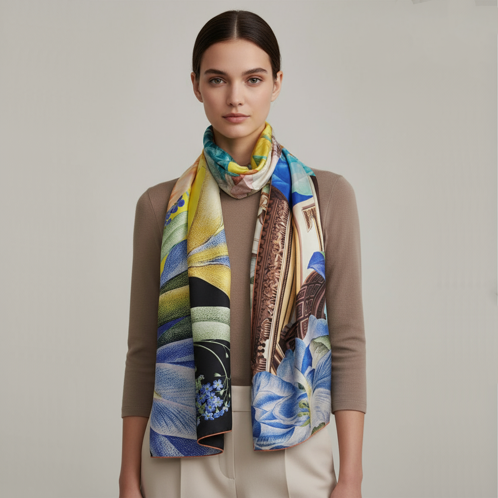 Cette étole est dessinée, imprimée et confectionnée à Lyon dans la pure tradition lyonnaise. Un format généreux pour une allure d'exception.