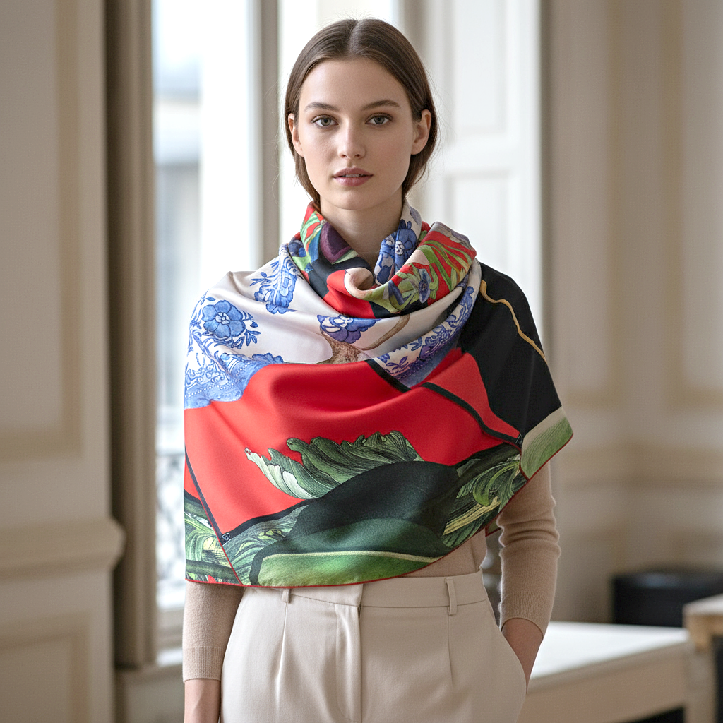 Cette étole est dessinée, imprimée et confectionnée à Lyon dans la pure tradition lyonnaise. Un format généreux pour une allure d'exception.