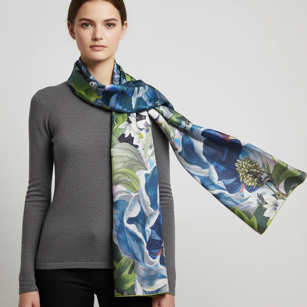 Cette étole est dessinée, imprimée et confectionnée à Lyon dans la pure tradition lyonnaise. Un format généreux pour une allure d'exception.