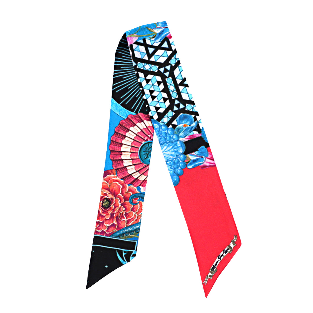 Imprimé sur un twill de soie 12 mommes choisi pour son tombé fluide, sa texture soyeuse et son éclat naturel, chaque ruban révèle une composition unique, issue de nos collections originales.