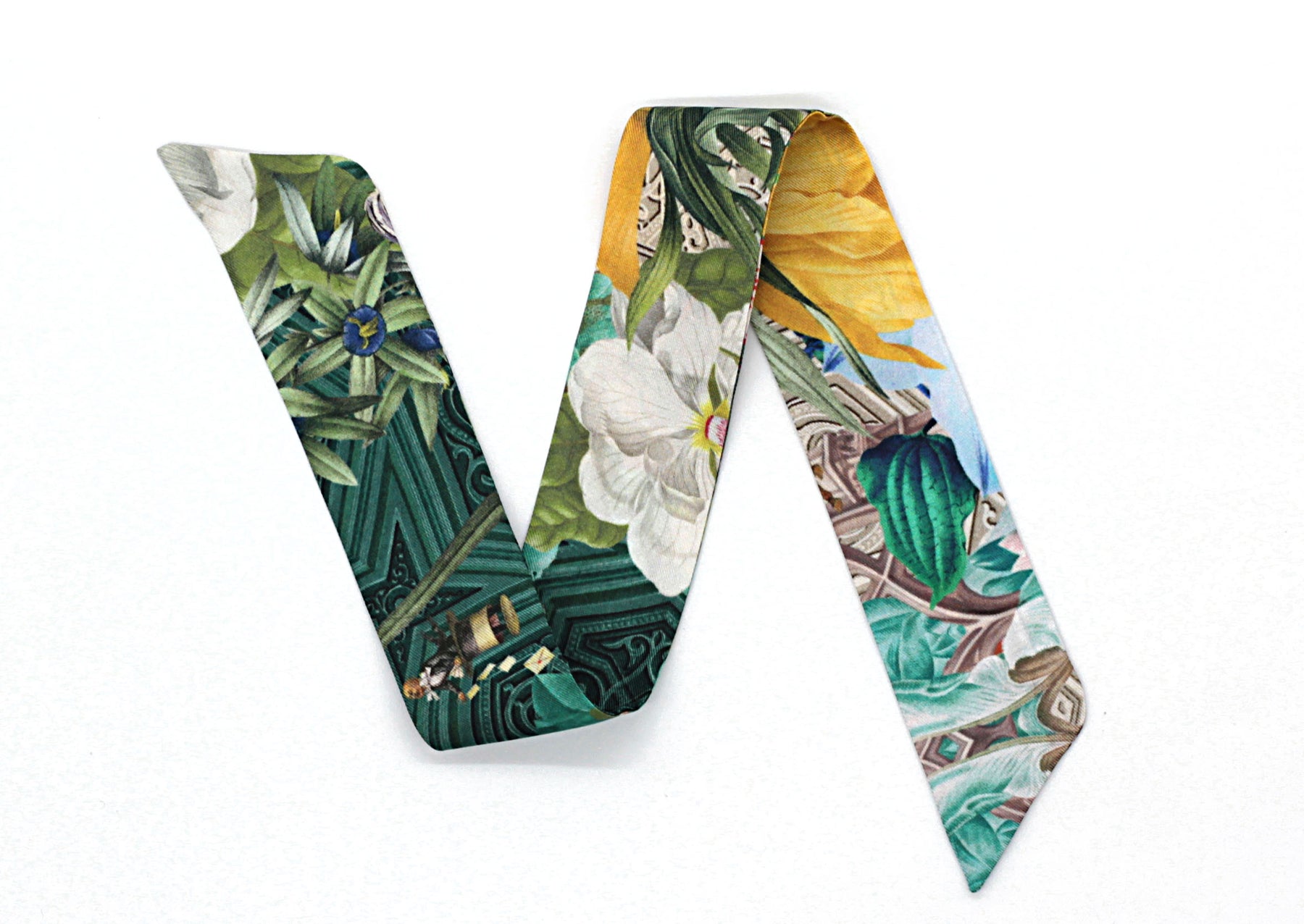 Imprimé sur un twill de soie 12 mommes choisi pour son tombé fluide, sa texture soyeuse et son éclat naturel, chaque ruban révèle une composition unique, issue de nos collections originales.