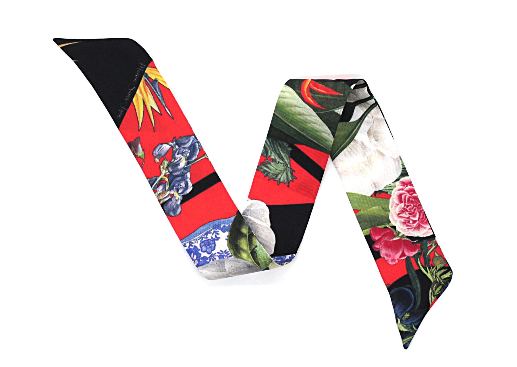 Imprimé sur un twill de soie 12 mommes choisi pour son tombé fluide, sa texture soyeuse et son éclat naturel, chaque ruban révèle une composition unique, issue de nos collections originales.