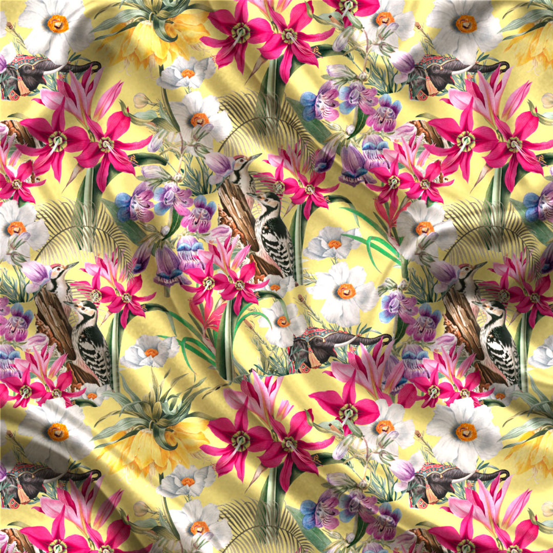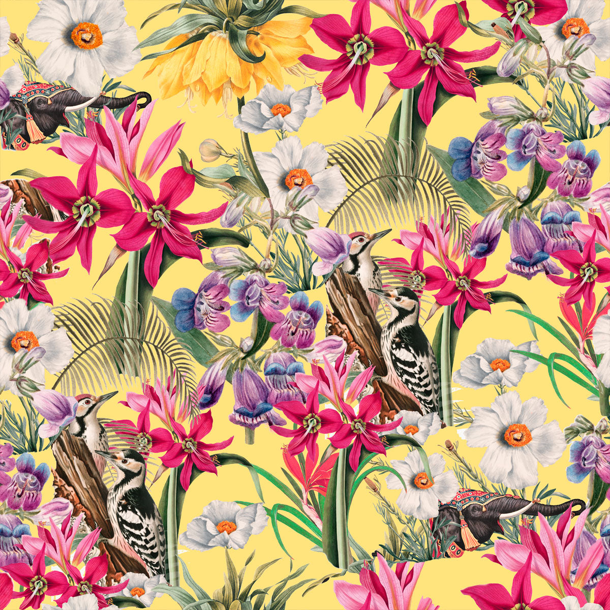 Sa palette lumineuse et contrastée met en valeur une composition florale et animalière raffinée.