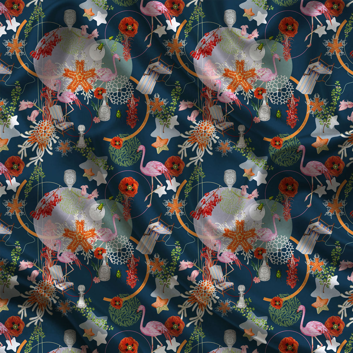 Étoiles d’azur est un dessin exclusif signé Maison Sams, imprimé sur une soie d’exception.Son décor foisonnant mêle inspirations marines et lignes graphiques contemporaines, révélées par une palette intense et raffinée.