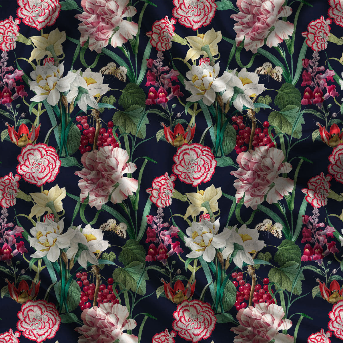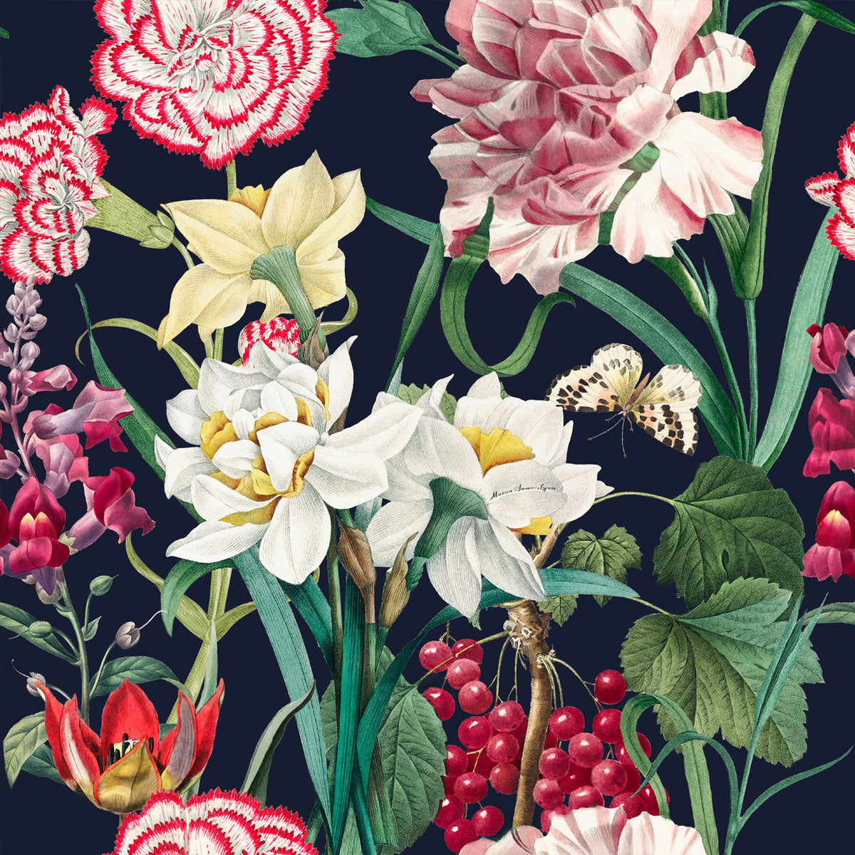 Les détails, inspirés des jardins à la française, se détachent sur un fond bleu marine profond, révélant la finesse du trait et la richesse des couleurs.