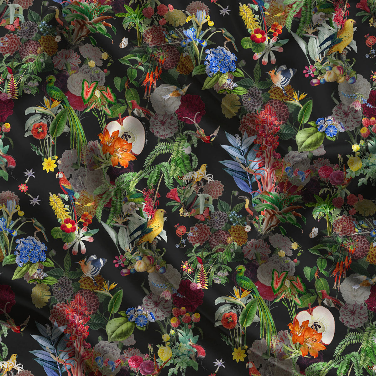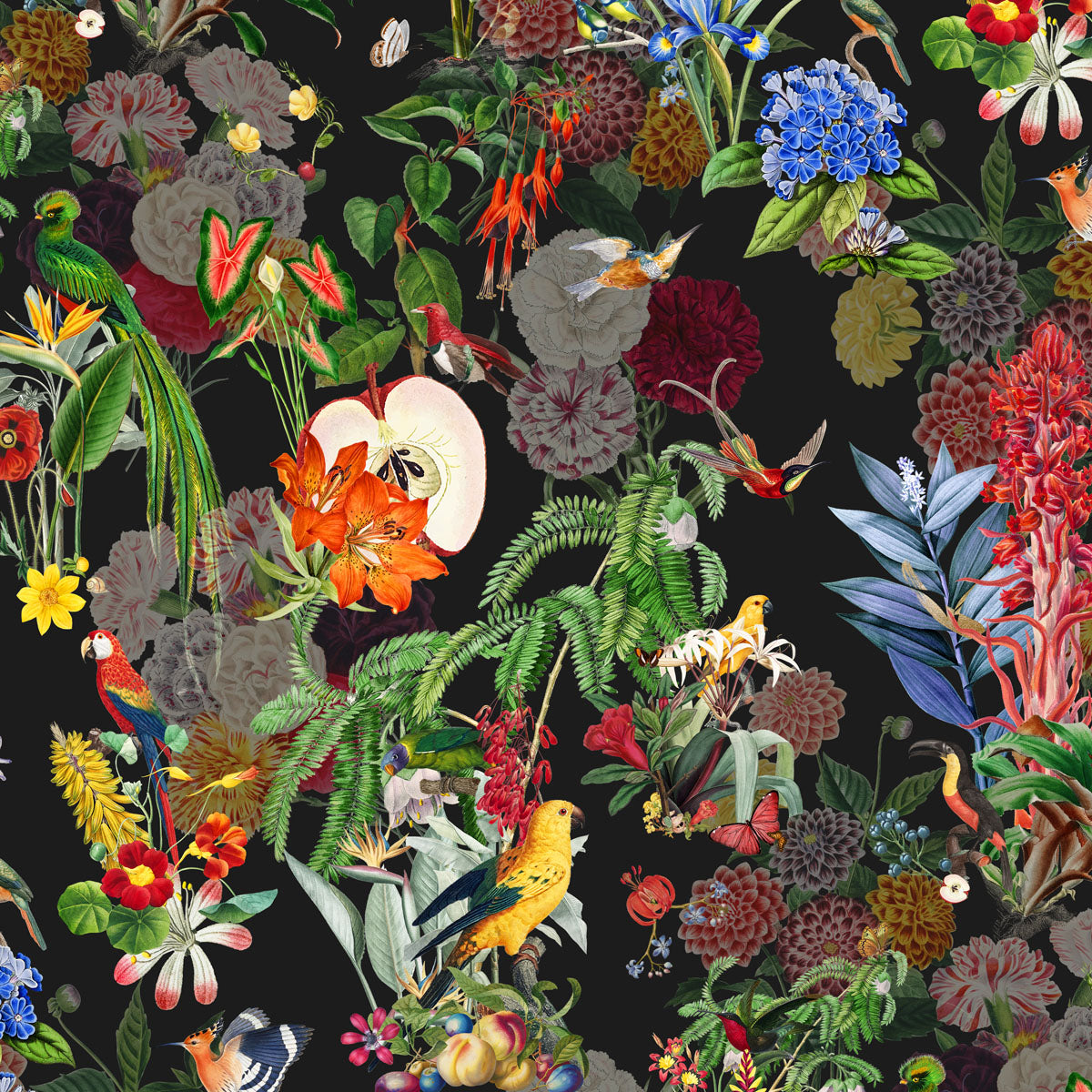 Fleurs opulentes, papillons aux ailes iridescentes, oiseaux colorés et silhouettes animales émergent d’un décor luxuriant, presque théâtral.