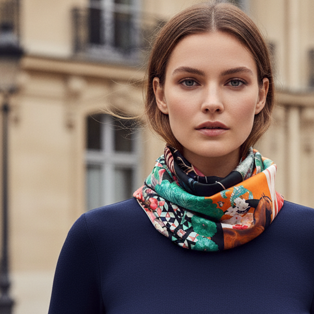 Dans le souffle tiède d’un soir d’été indien, ce snood danse comme un mirage. Enveloppé dans ses teintes flamboyantes d’orange brûlé, de turquoise céladon et de noir profond, ce tour de cou en soie nous emporte dans une odyssée chatoyante, entre éclosions florales, géométries sacrées et chevaux au galop.