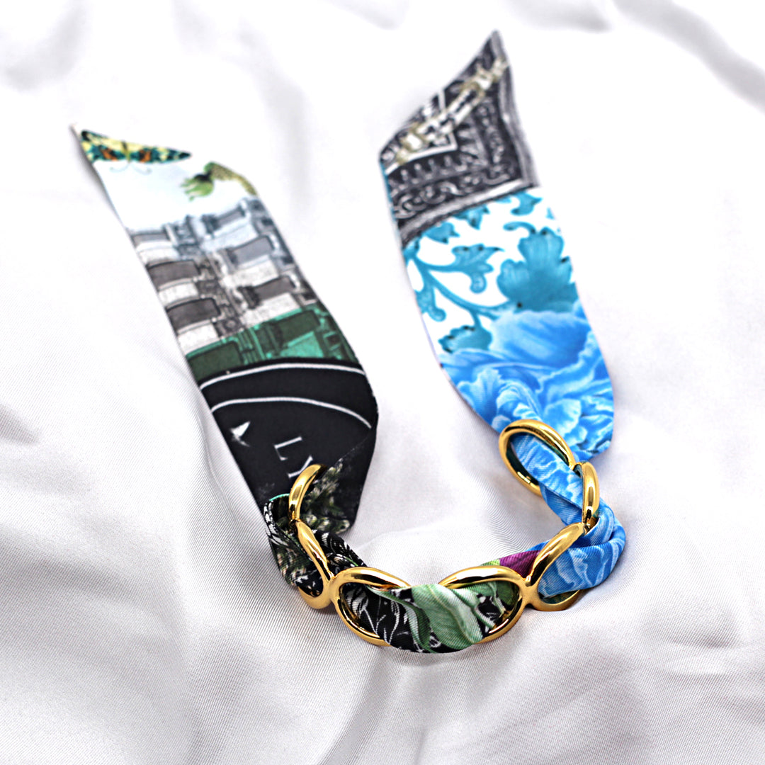 Notre bracelet emblématique marie la noblesse du laiton doré à l’or fin 18 carats à la délicatesse d’un mini twill de soie imprimée, interchangeable à l’infini.